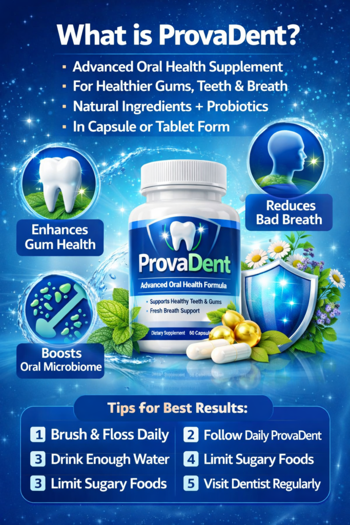 Provadent is a dietary supplement designed to support oral and dental health naturally. It is formulated to complement regular oral hygiene habits by helping maintain a healthy balance of oral bacteria. Instead of replacing brushing or dental visits, Provadent works as an additional layer of support.